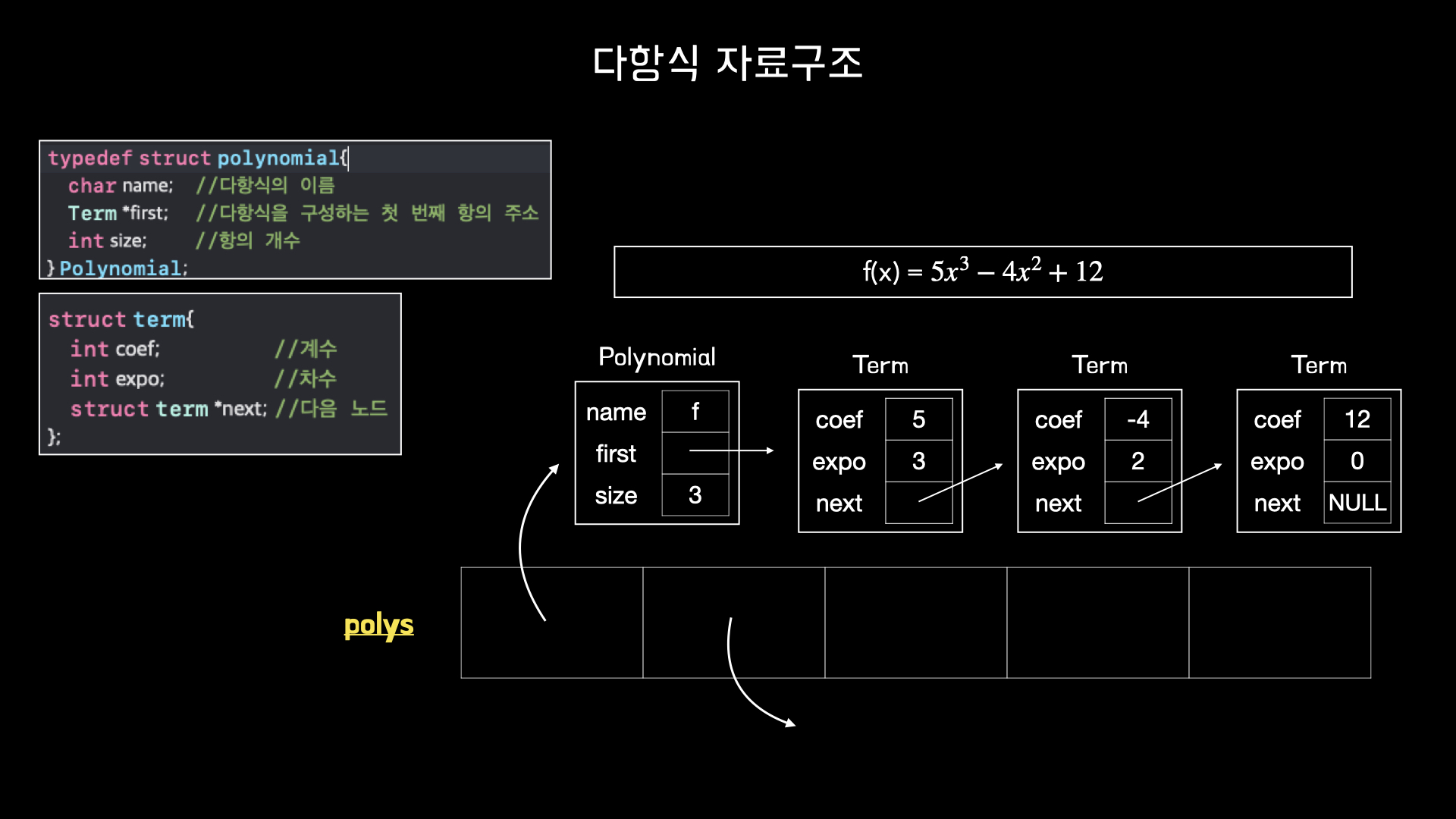 - 연결리스트를 이용하여 하나의 다항식을 표현하는 구조체 Polynomial을 정의