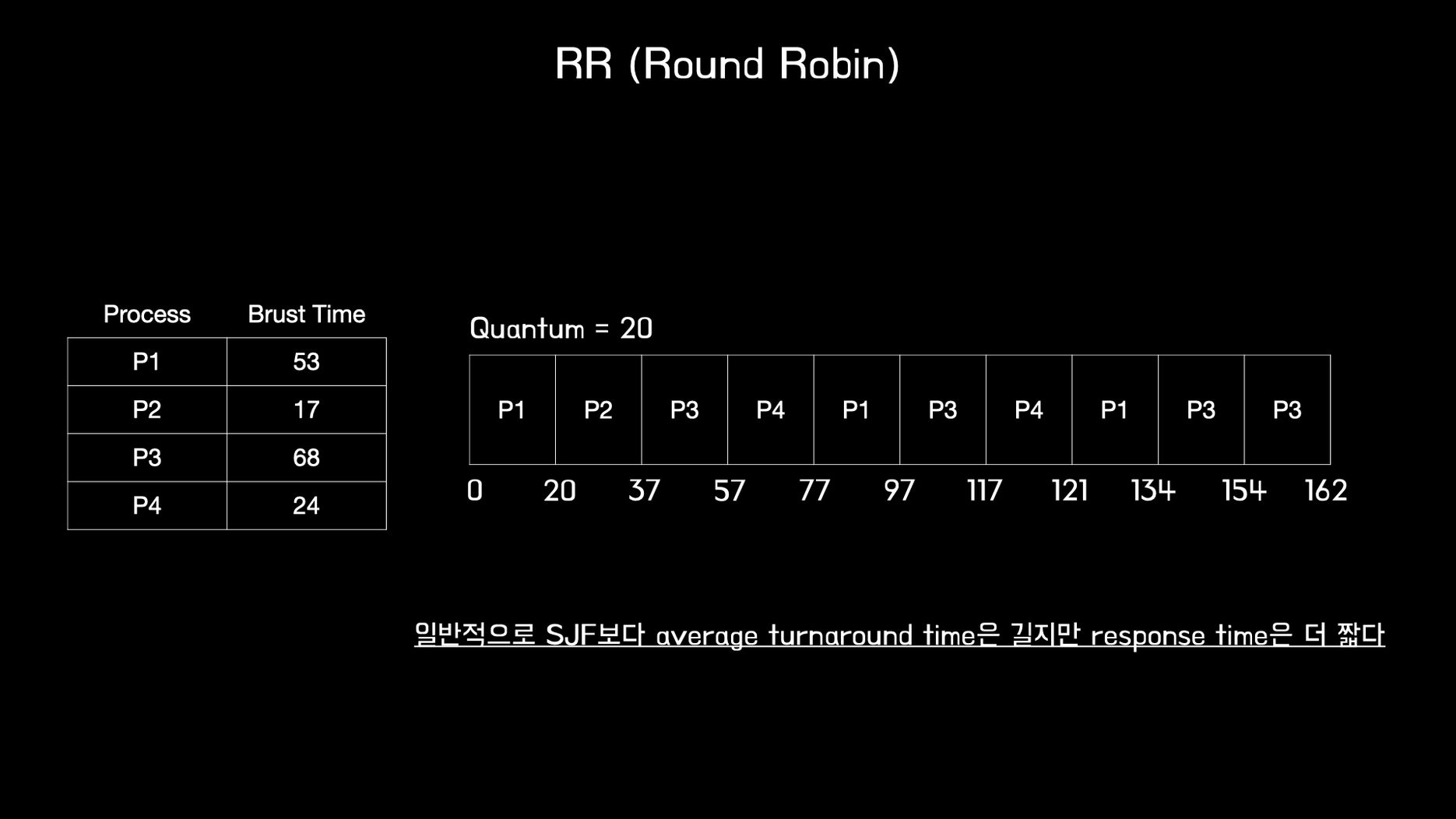 - 일반적으로 SJF보다 average turnaround time이 길지만, 최초로 CPU를 얻는 response time은 더 짧다.