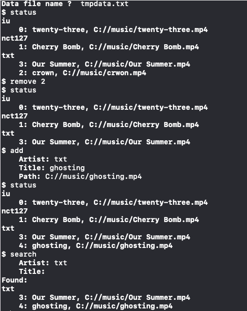 status - 저장된 모든 노래의 번호, 가수, 제목, 파일의 경로명을 출력- 노래의 번호는 입력 순서대로 번호 할당
