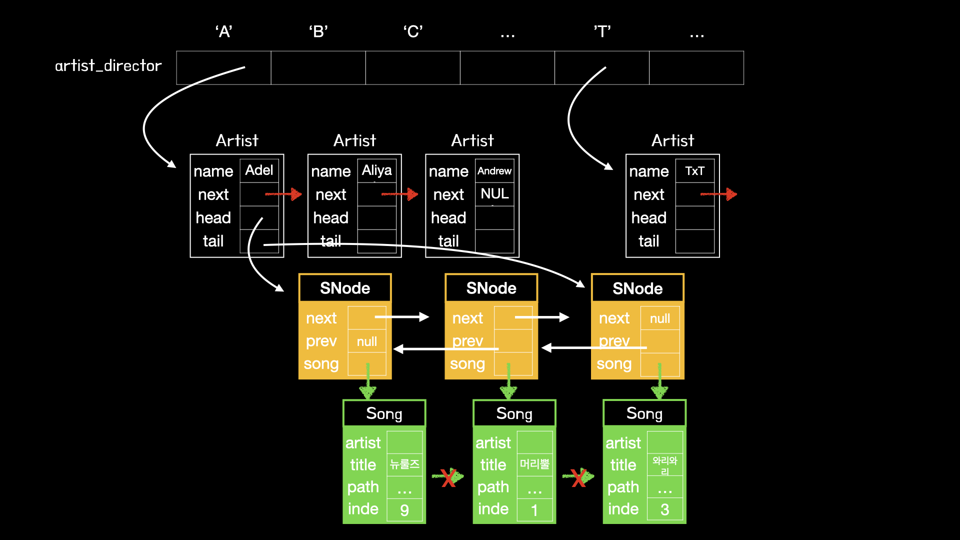 - artist_directory 아래의 양방향 연결 리스트 SNode 또한 삭제해야 한다.