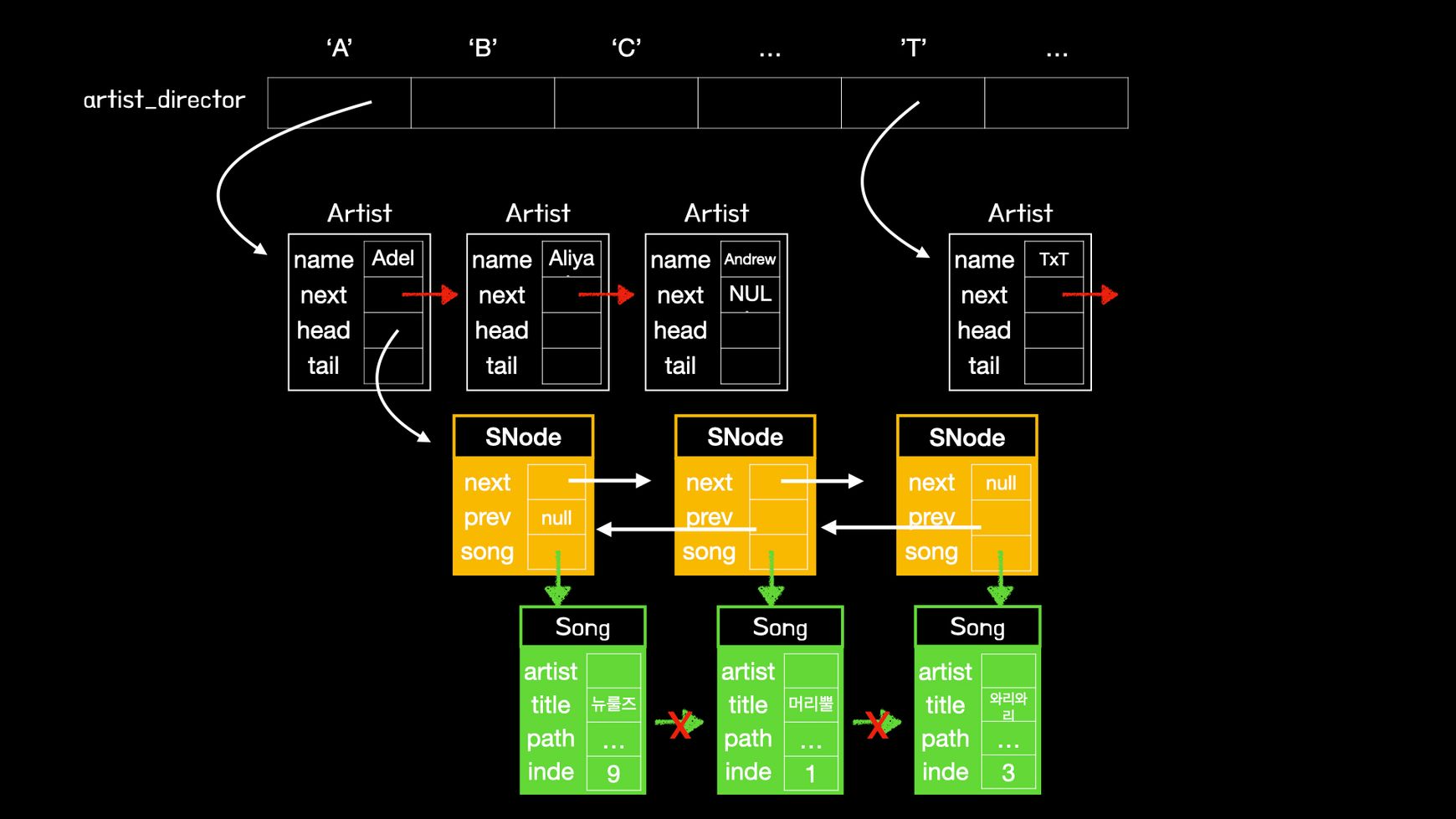 - artist_directory 아래의 양방향 연결리스트 SNode 또한 삭제해야 한다.